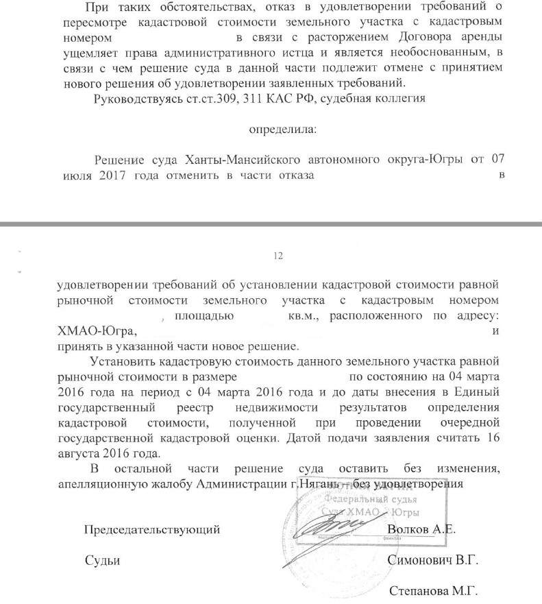 В конечном итоге, судебная коллегия апелляционной инстанции приняла нашу позицию, и апелляционная жалоба была удовлетворена. Решение в данной части было отменено и апелляционной инстанцией принято по делу новое решение об удовлетворении исковых требований о снижении кадастровой стоимости объекта недвижимости, по которому договор аренды был уже расторгнут.